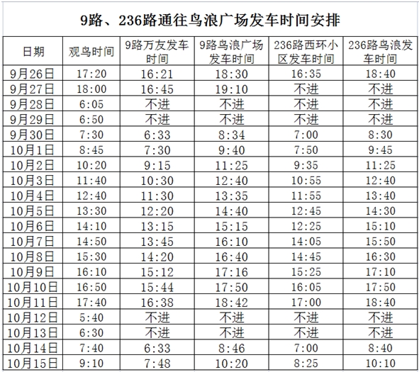 為方便市民“國(guó)慶”“中秋”節(jié)日期間觀賞自然景觀時(shí)順暢出行,營(yíng)口交運(yùn)集團(tuán)適時(shí)調(diào)整部分公交線路班次。從9月26日起—10月15日,公交9路、236路分時(shí)段區(qū)間延伸至大遼河口鳥浪廣場(chǎng)運(yùn)營(yíng)。